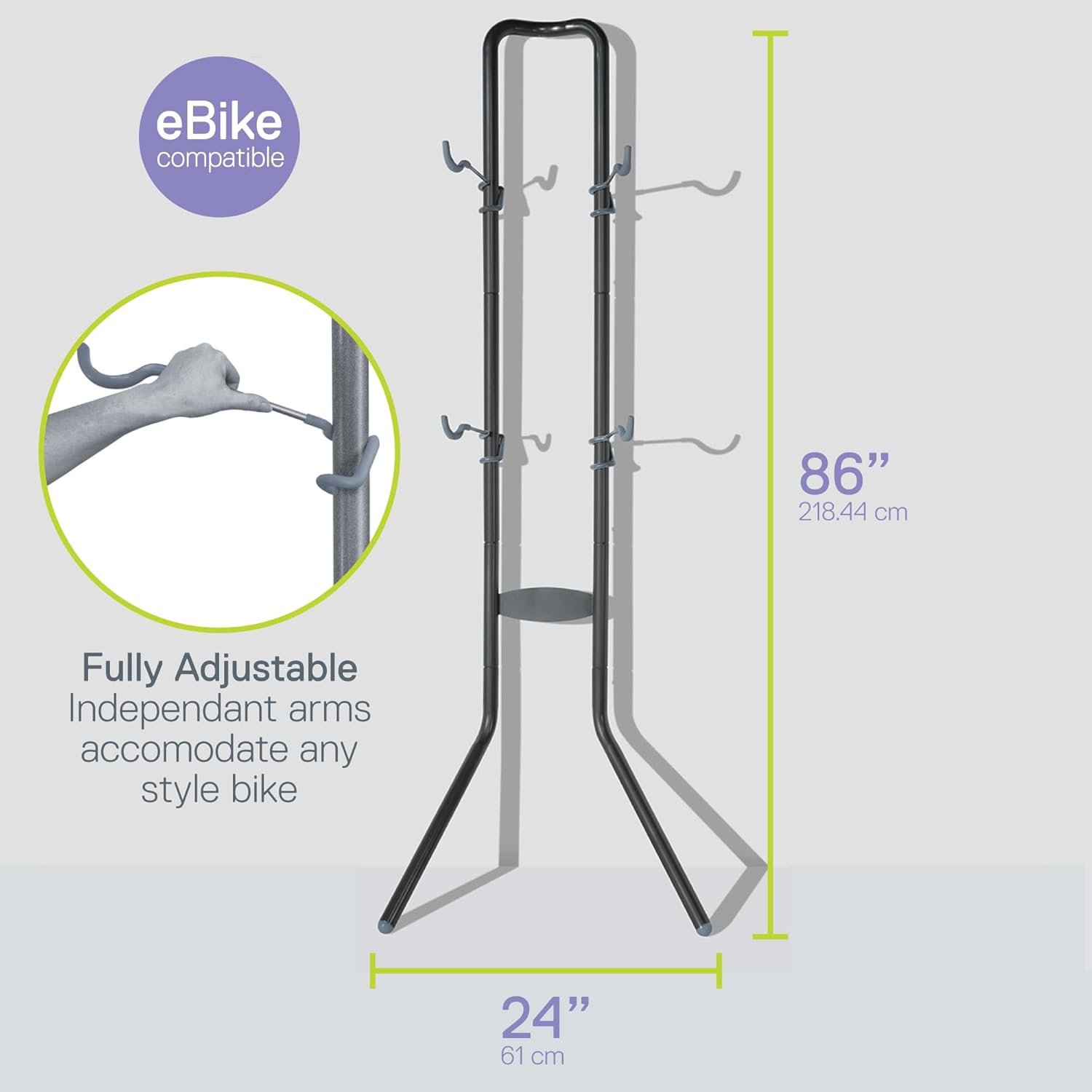 The freestanding device features adjustable arms coated with non-slip rubber, providing a secure hold while protecting bike frames.