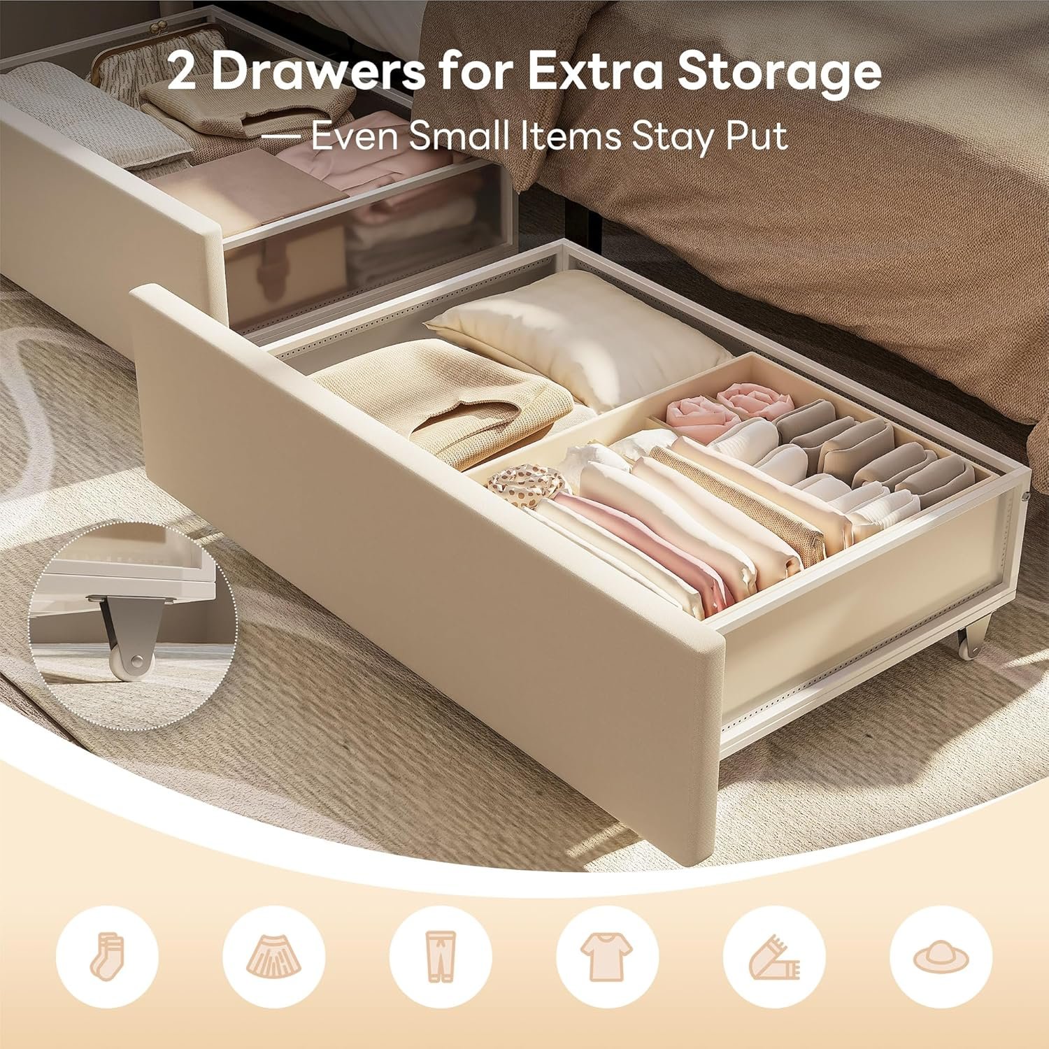 • Built-in Storage: Comes with two spacious drawers under the bed that glide smoothly on metal rails, ideal for storing clothing and bedding.