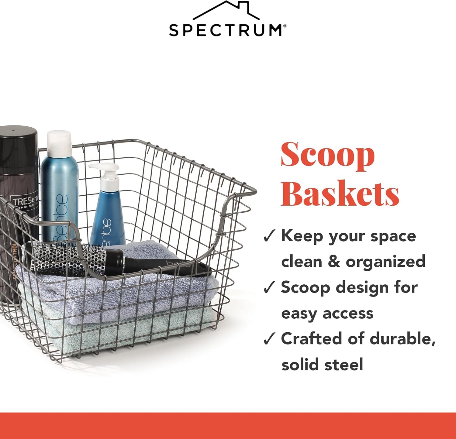 - The Spectrum Wire Scoop Basket review specifically features a patented scoop design for easy access and visibility, along with durable steel construction that ensures longevity and efficient home organization.