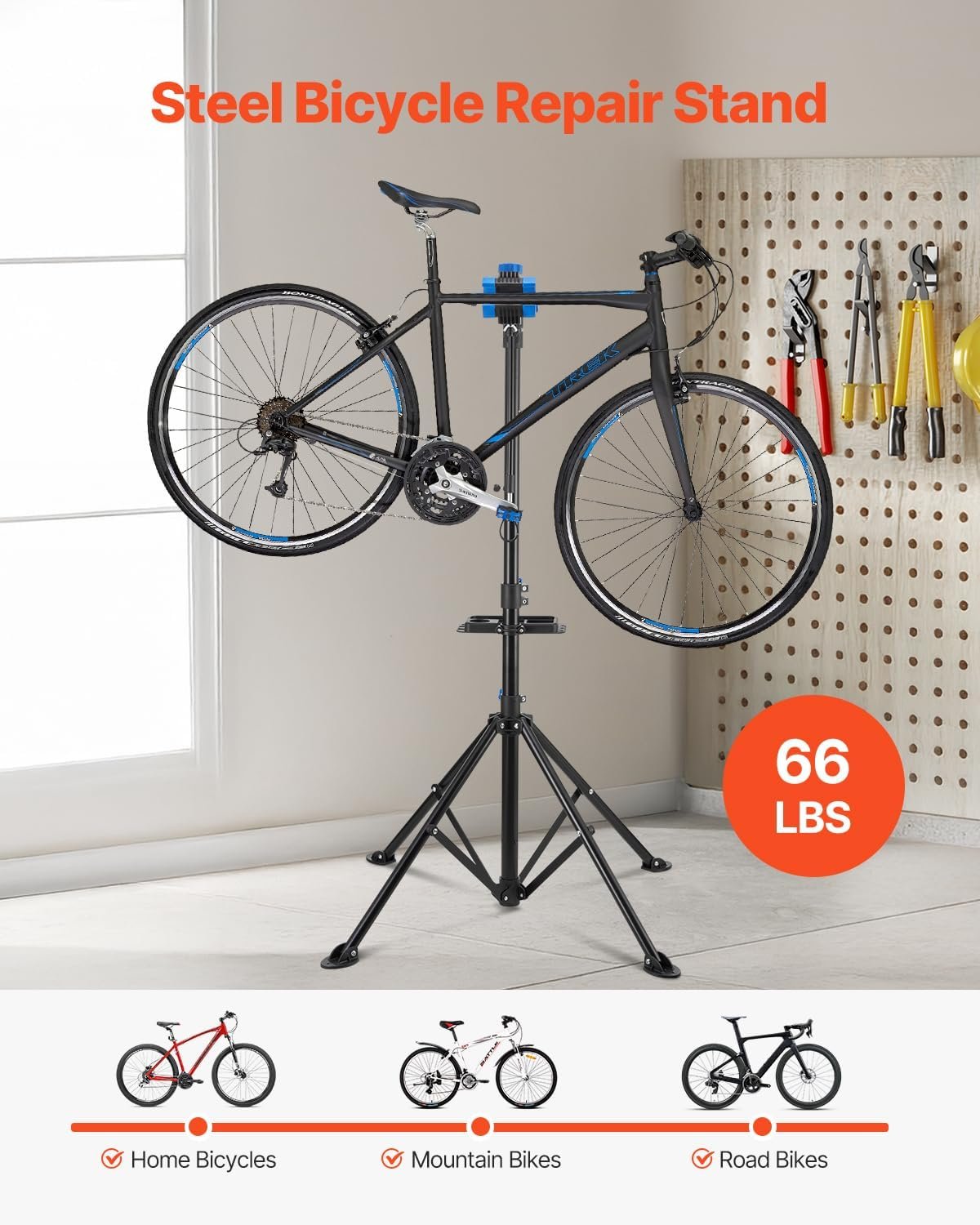 This product supports up to 66 lbs with its alloy steel frame and offers adjustable height from 32.8 to 56.6 inches, making maintenance more comfortable. It features a magnetic tool tray to keep your tools organized and a 360 degree rotating clamp for versatile bike positioning.